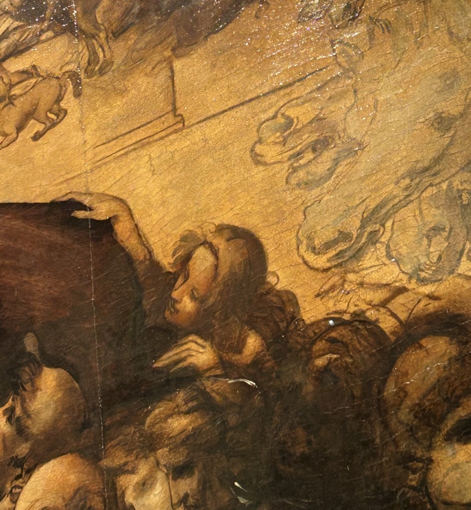 In the Uffizi Gallery in Florence, Italy, hangs The Adoration of the Magi, a large oil painting by Leonardo da Vinci. I snapped the pic below (tightly cropped) during our trip to Europe last summer.